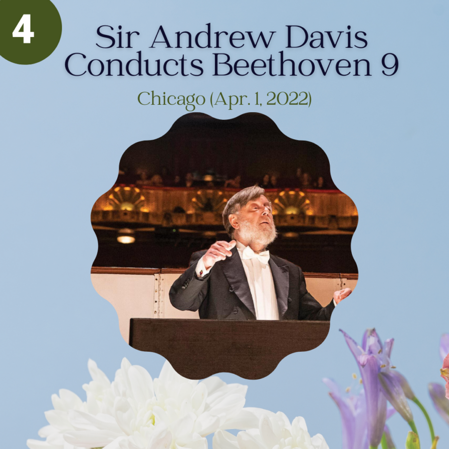 4. Sir Andrew Davis Conducts Beethoven 9 presented by Lyric Opera of Chicago (04/01/2022 - 04/01/2022) : Lyric will celebrate Sir Andrew Davis's magnificent two-decade tenure as music director with one of his favorite works, never previously performed at Lyric: Beethoven's enthralling, life-enhancing Symphony No. 9, the "Choral," music's most exalted hymn to the human spirit.