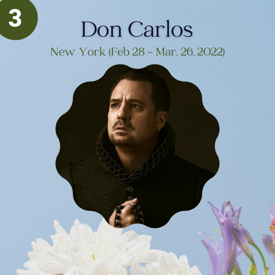 3. Don Carlos presented by The Metropolitan Opera (02/28/2022 - 03/26/2022): For the first time in company history, the Met presents the original five-act French version of Verdi's epic opera of doomed love among royalty, set against the backdrop of the Spanish Inquisition. Don Carlos, a Spanish crown prince and daughter of the King of France falls in love, only to be torn apart by international politics when Carlo's father, King Philip II decides to marry Elizabeth himself.